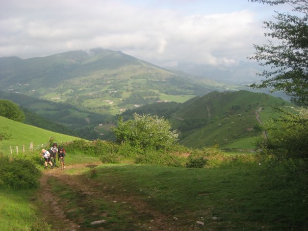 At the cross, man tells in French joke about an animal living around here with right legs shorter than left legs, so it can walk on a slope. Impossible to push over. Walking with jovial, multilingual bald guy, Alfredo, and two brothers.
